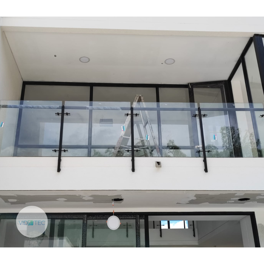 Pasamanos en vidrio templado con postes en accesorios en acero inoxidable y pintura negra electrostática.